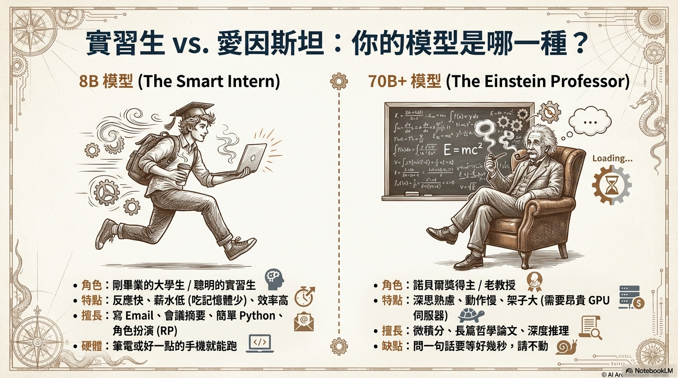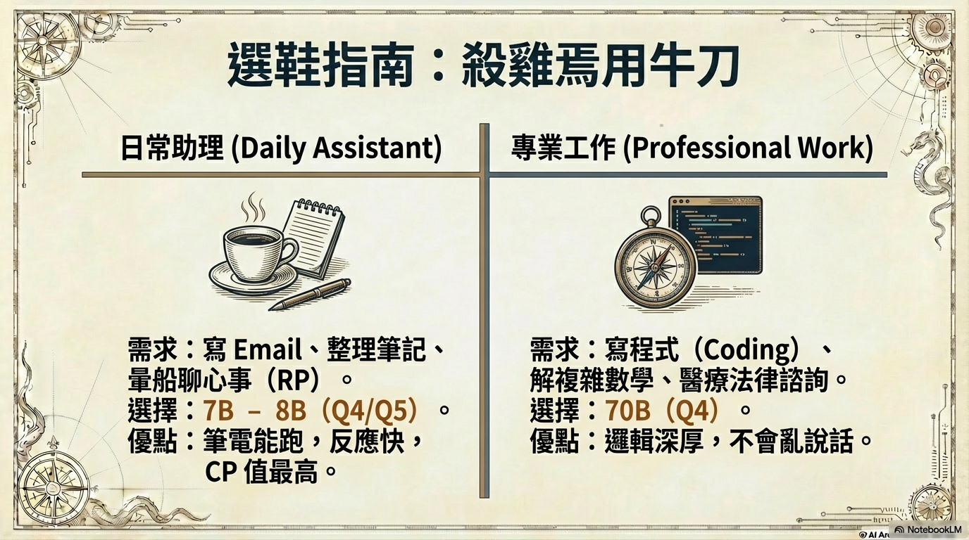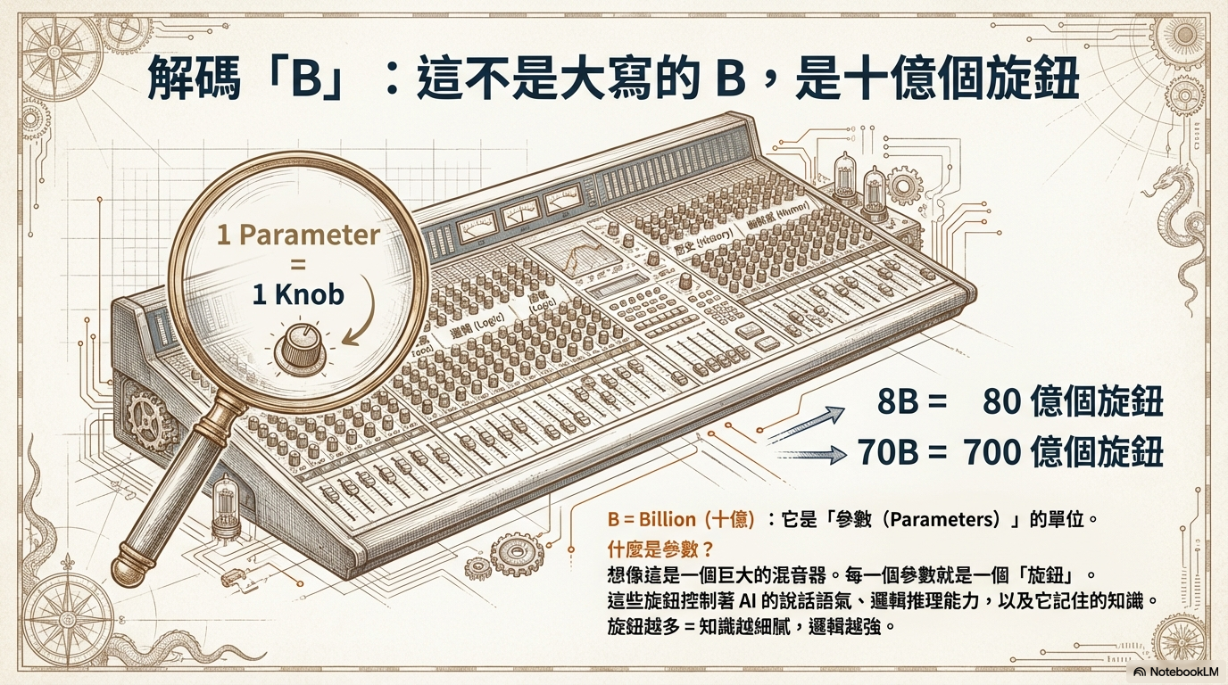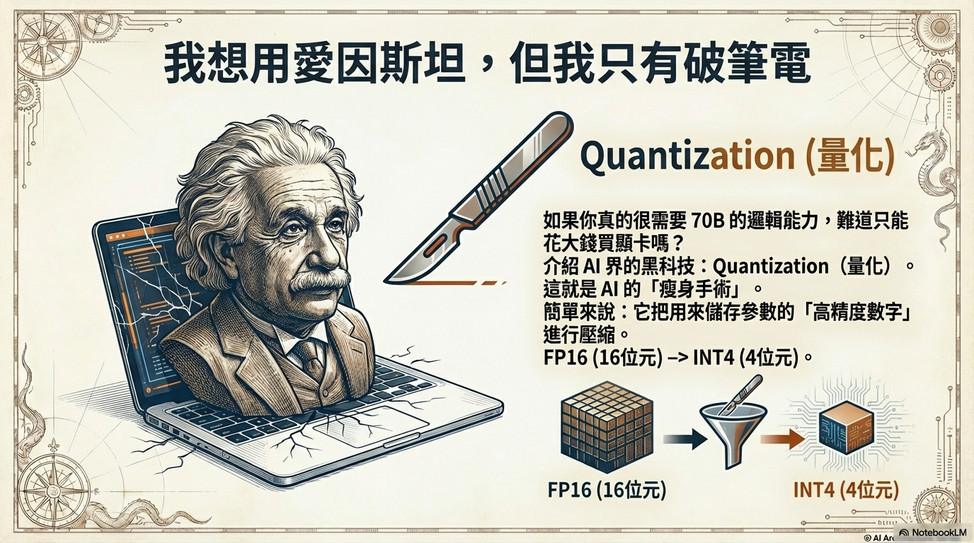 解釋 7B/70B 代表的意義,利用「量化」技術將大模型壓縮進小設備的原理,打破「模型越大越好」的迷思。