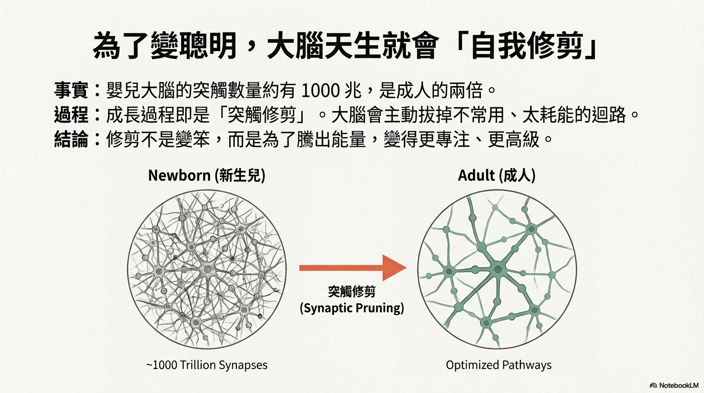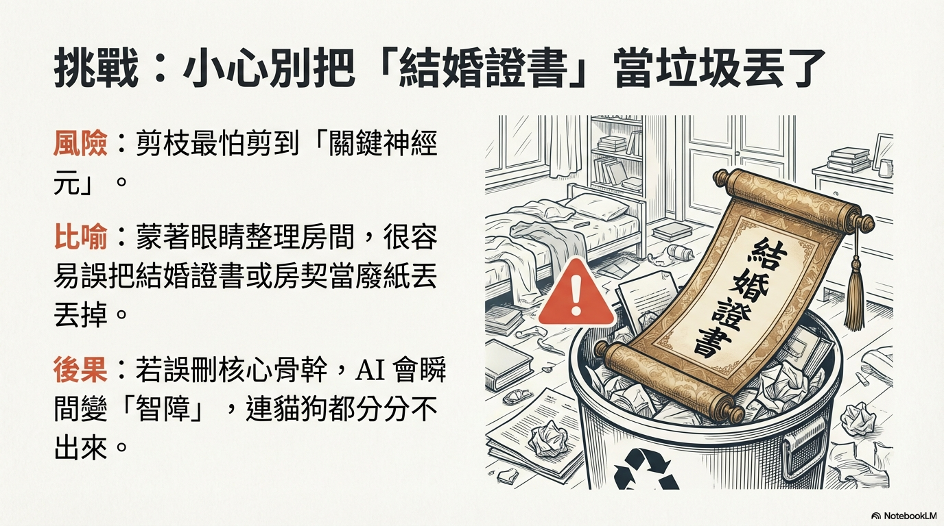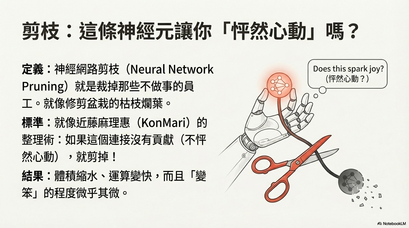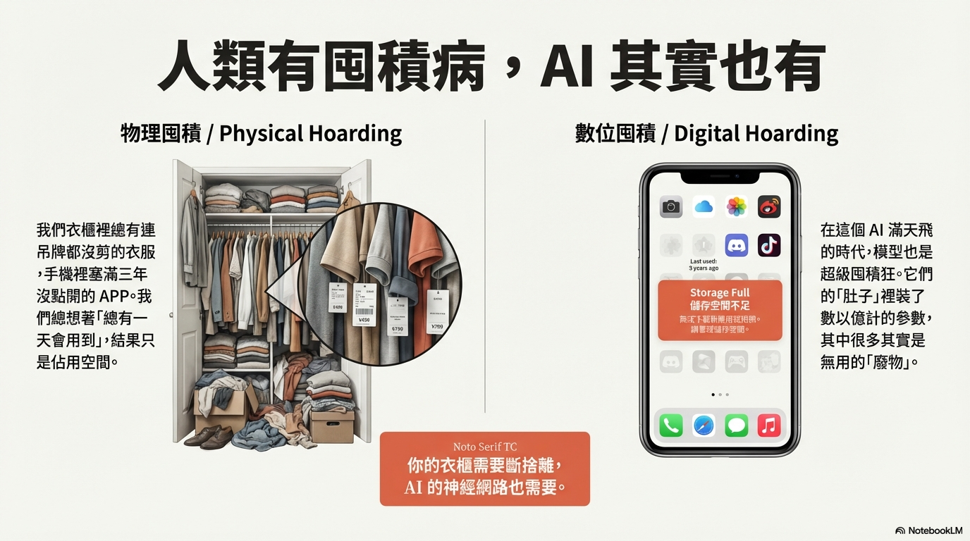 超有共鳴的「居家斷捨離」與大腦演化史,帶你輕鬆秒懂 AI 是如何透過「神經網路剪枝」剔除冗員,讓模型成功瘦身卻依然聰明絕頂!