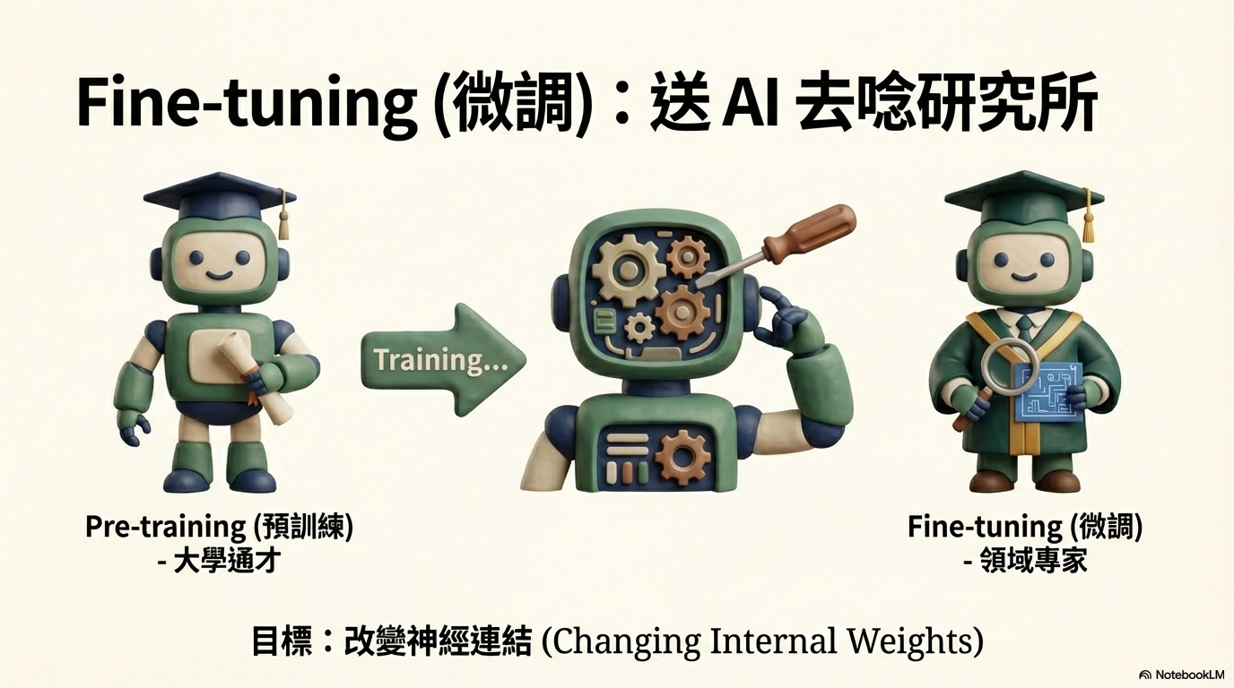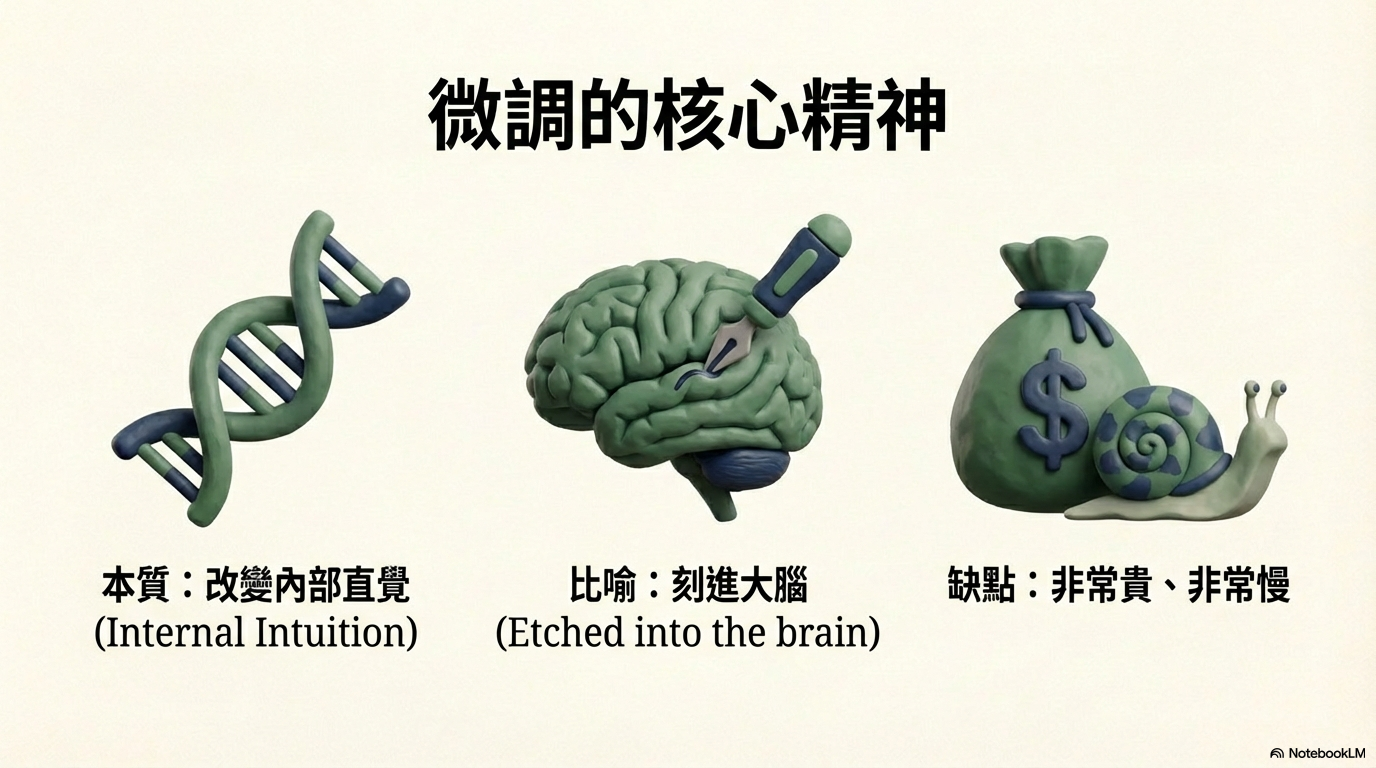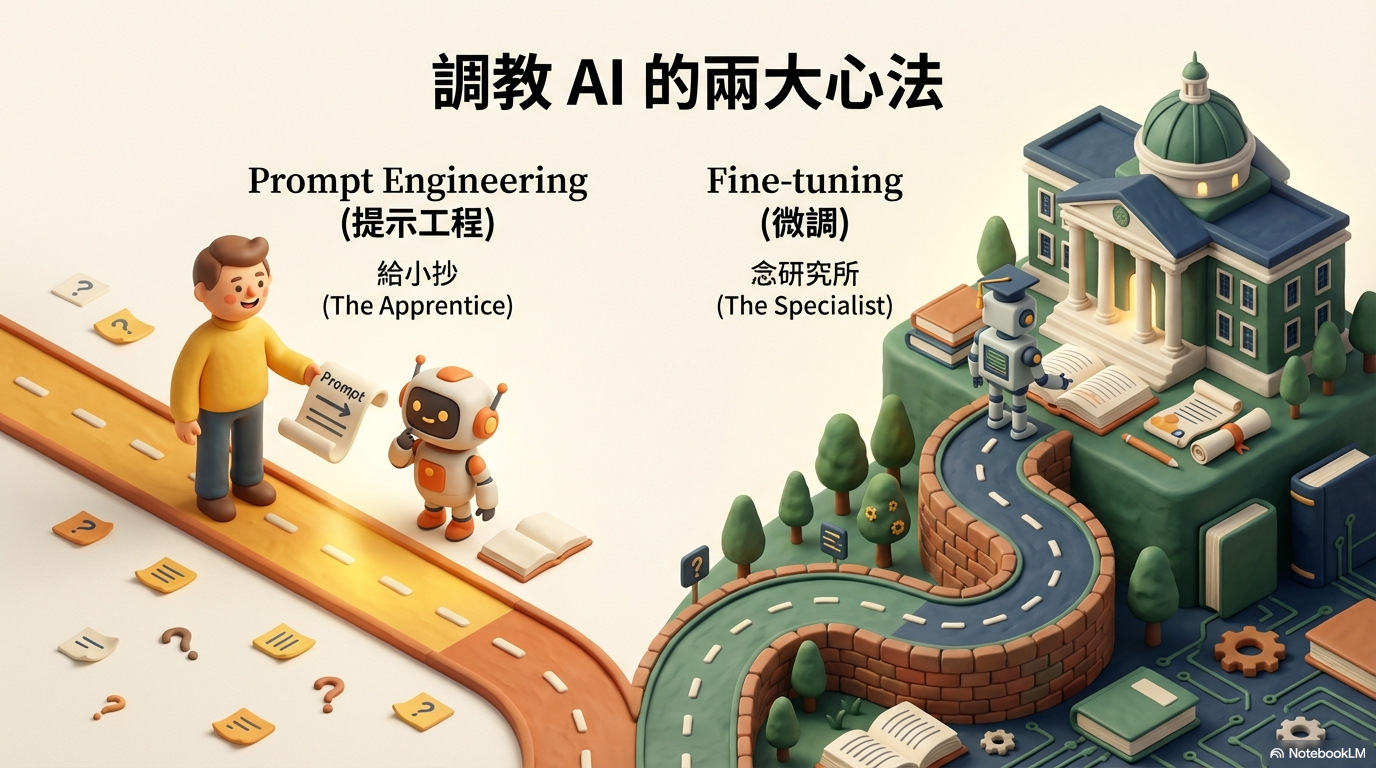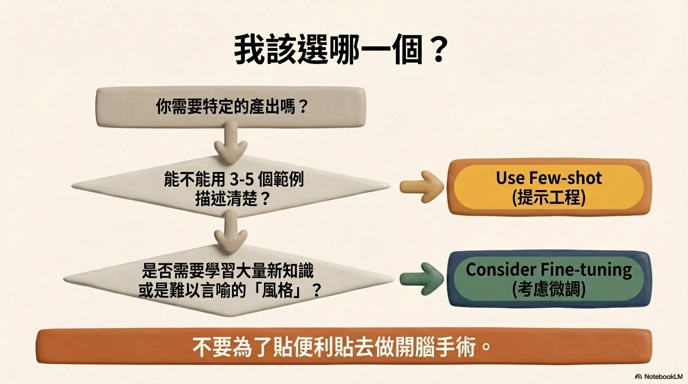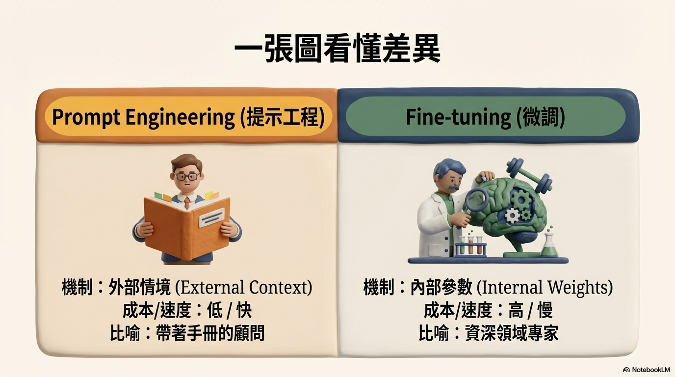 區分「提示工程」與「微調」的差異。解釋何時該用 Prompt 解決(低成本),何時該花錢做 Fine-tuning(特定格式/語氣)。