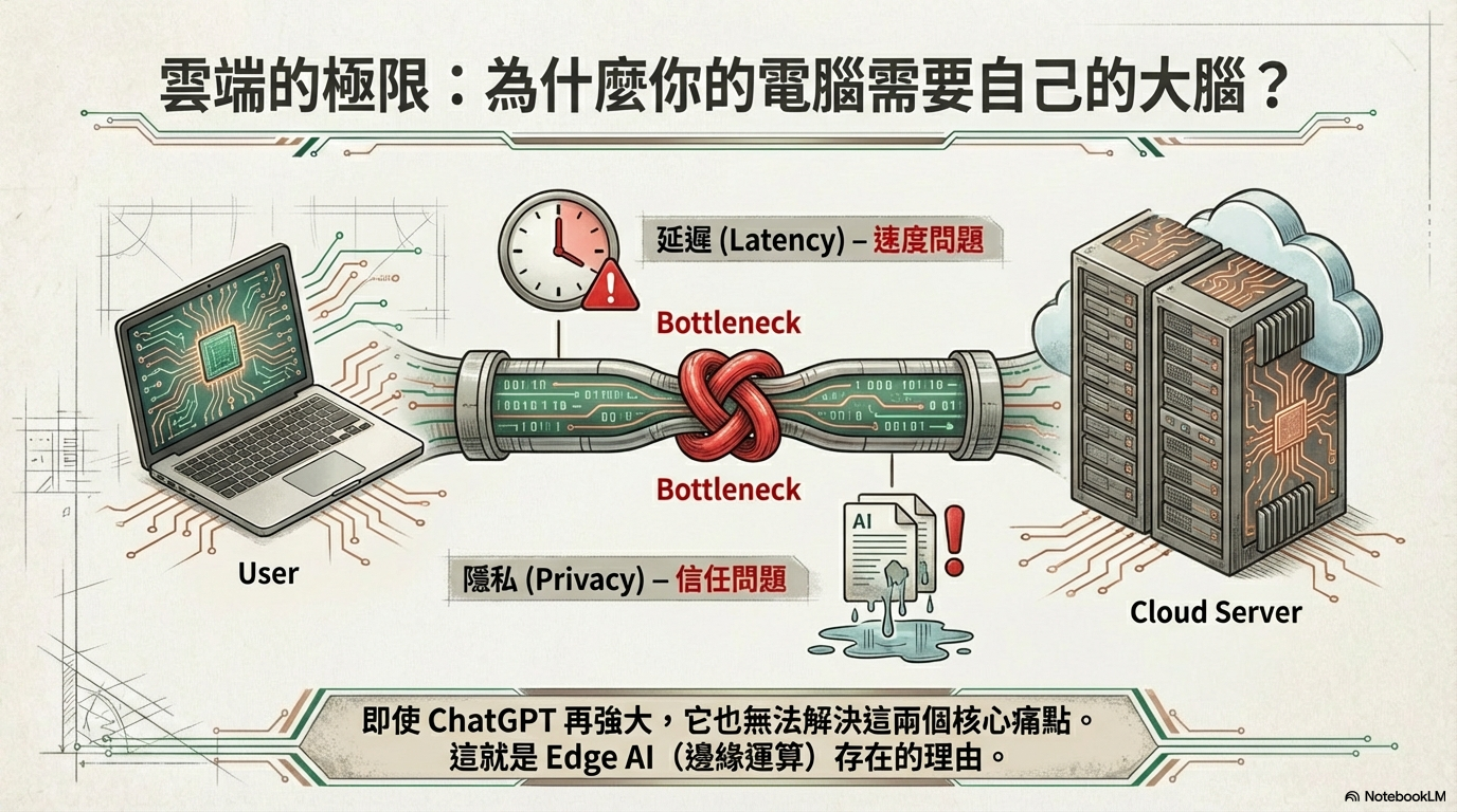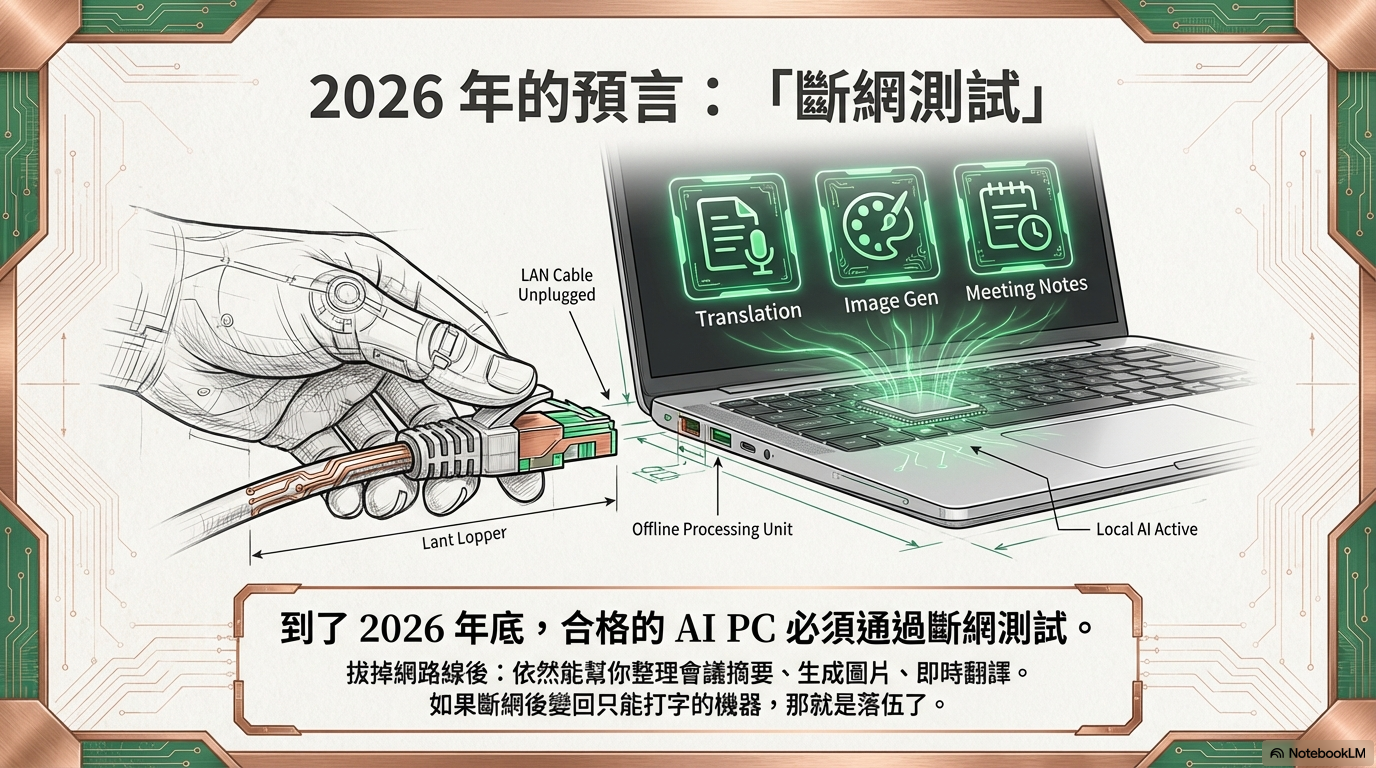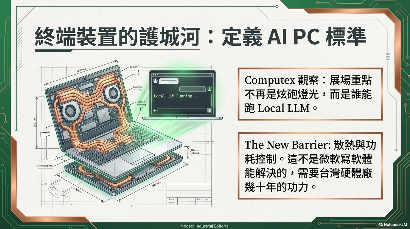 探討 AI 從雲端走入地端(本機)的趨勢,分析 NPU 的重要性,以及台灣晶片(聯發科)與品牌(華碩/宏碁)在 AI PC 浪潮中的關鍵角色。