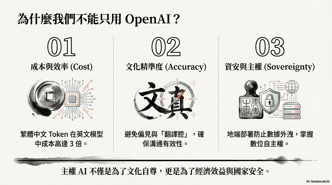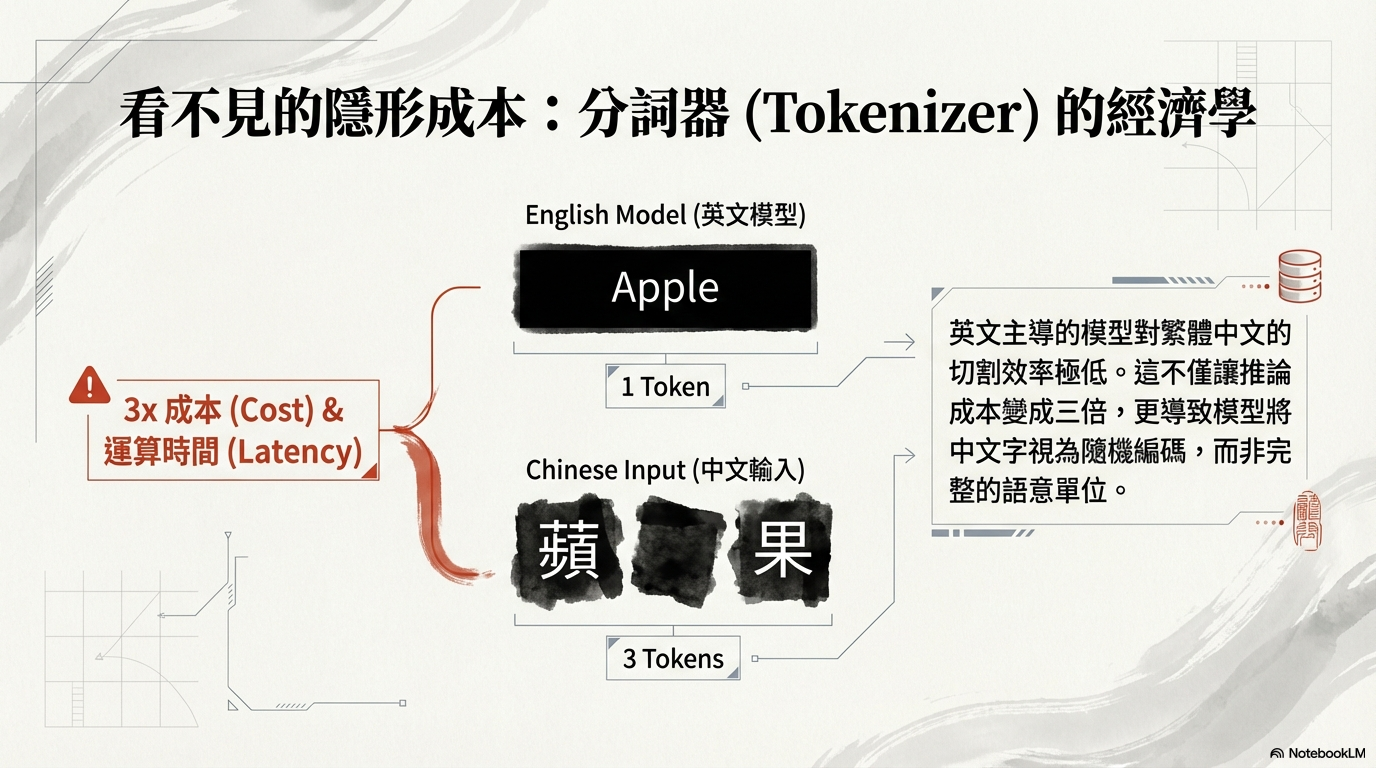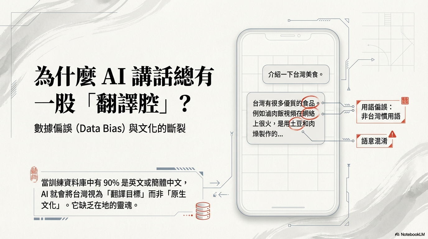 解釋數據偏誤如何影響 AI 的回答,探討 tokenizer 對繁中成本的影響,並介紹 Project TAME 與 TAIDE 如何解決台灣文化理解問題。
