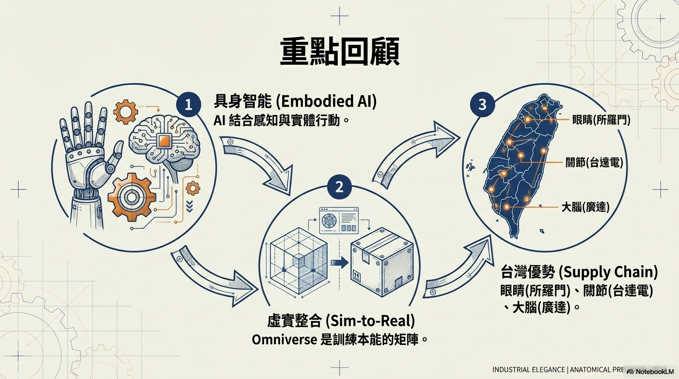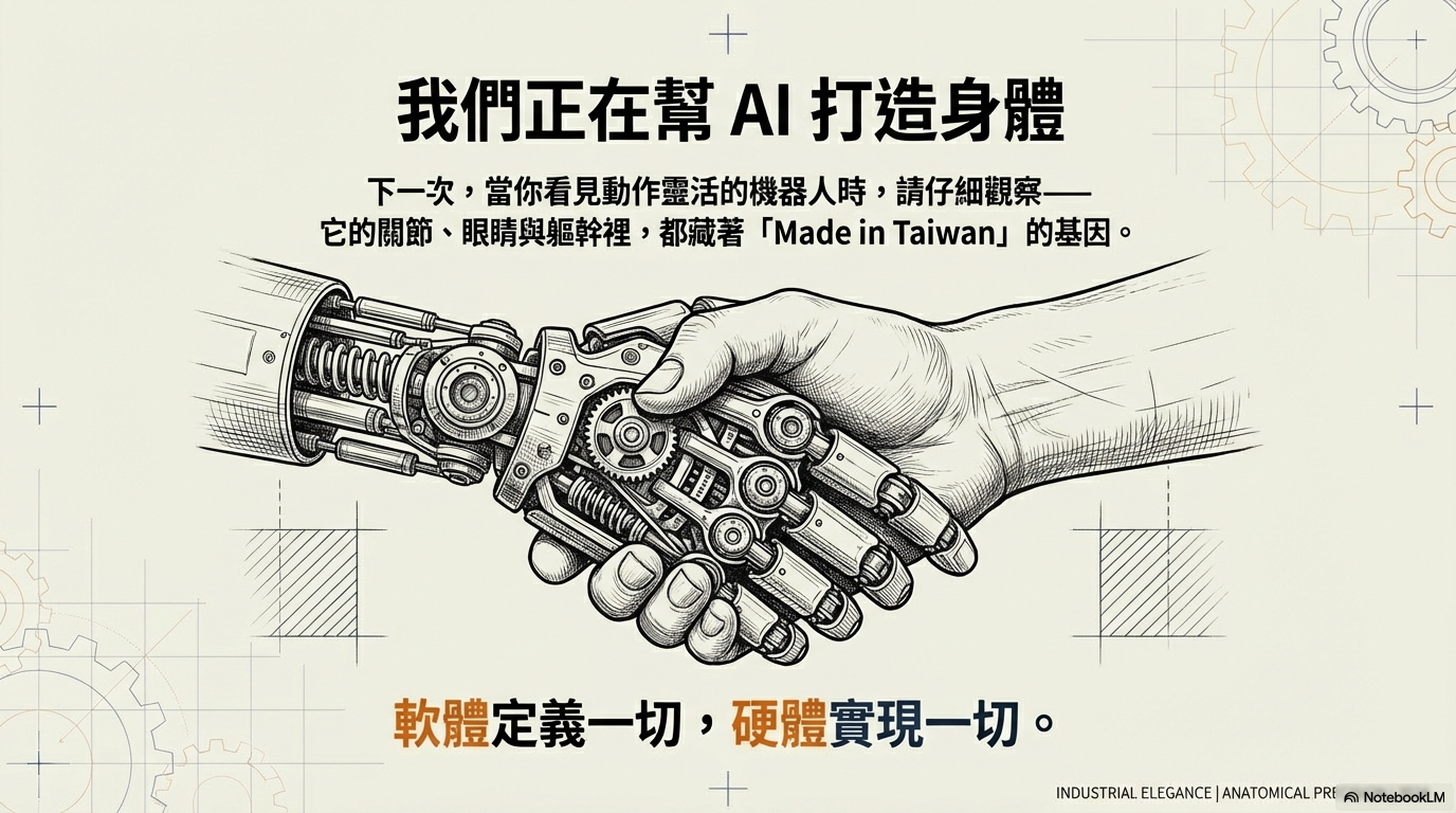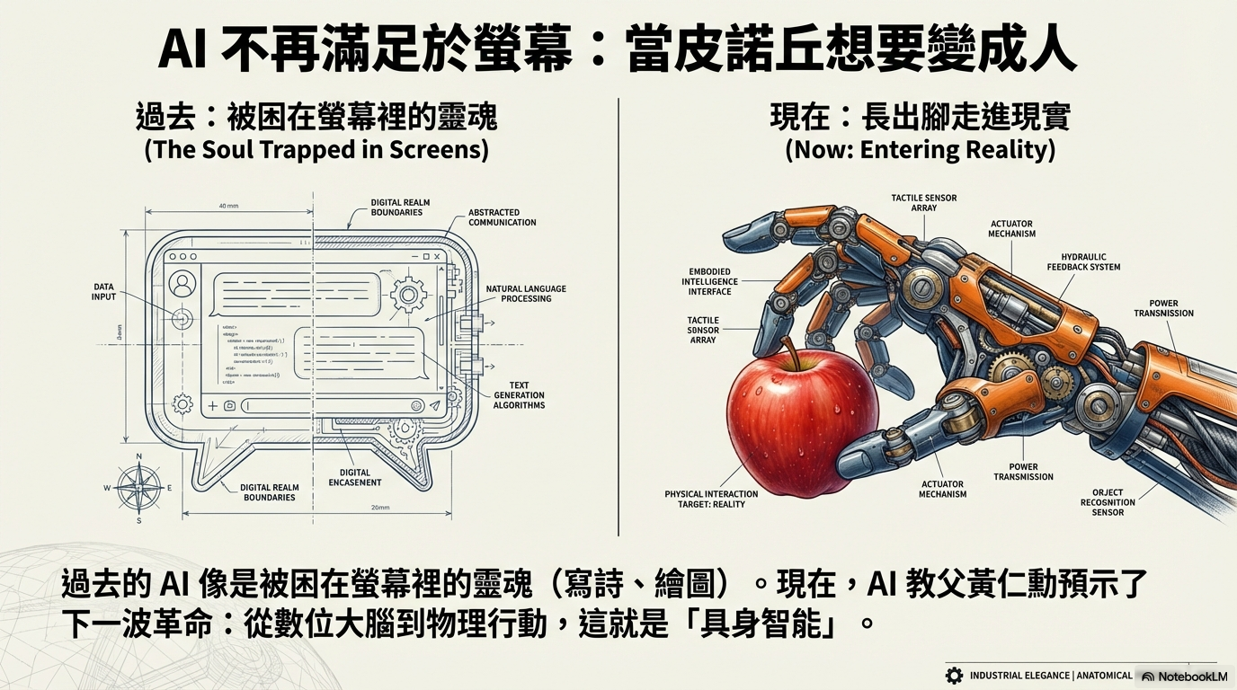 介紹 AI 如何從螢幕走入現實世界,結合視覺模型與機械控制。點名所羅門、廣達等台灣供應鏈如何成為機器人的軍火庫。