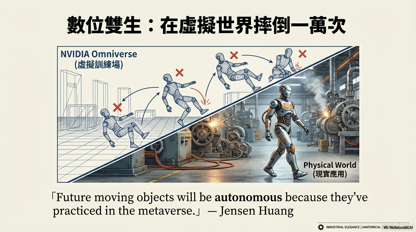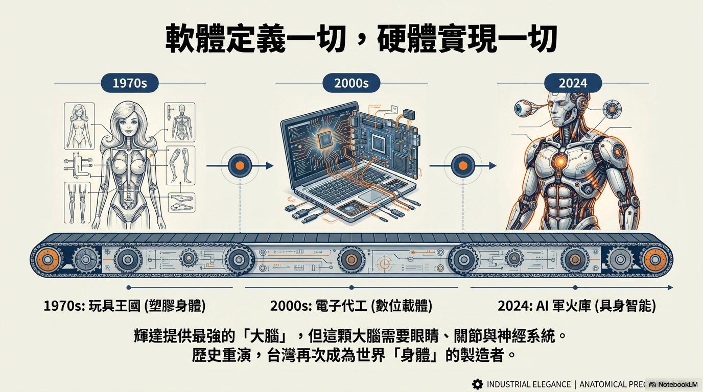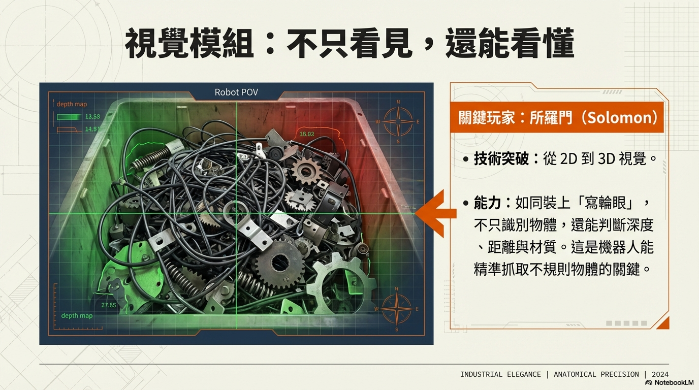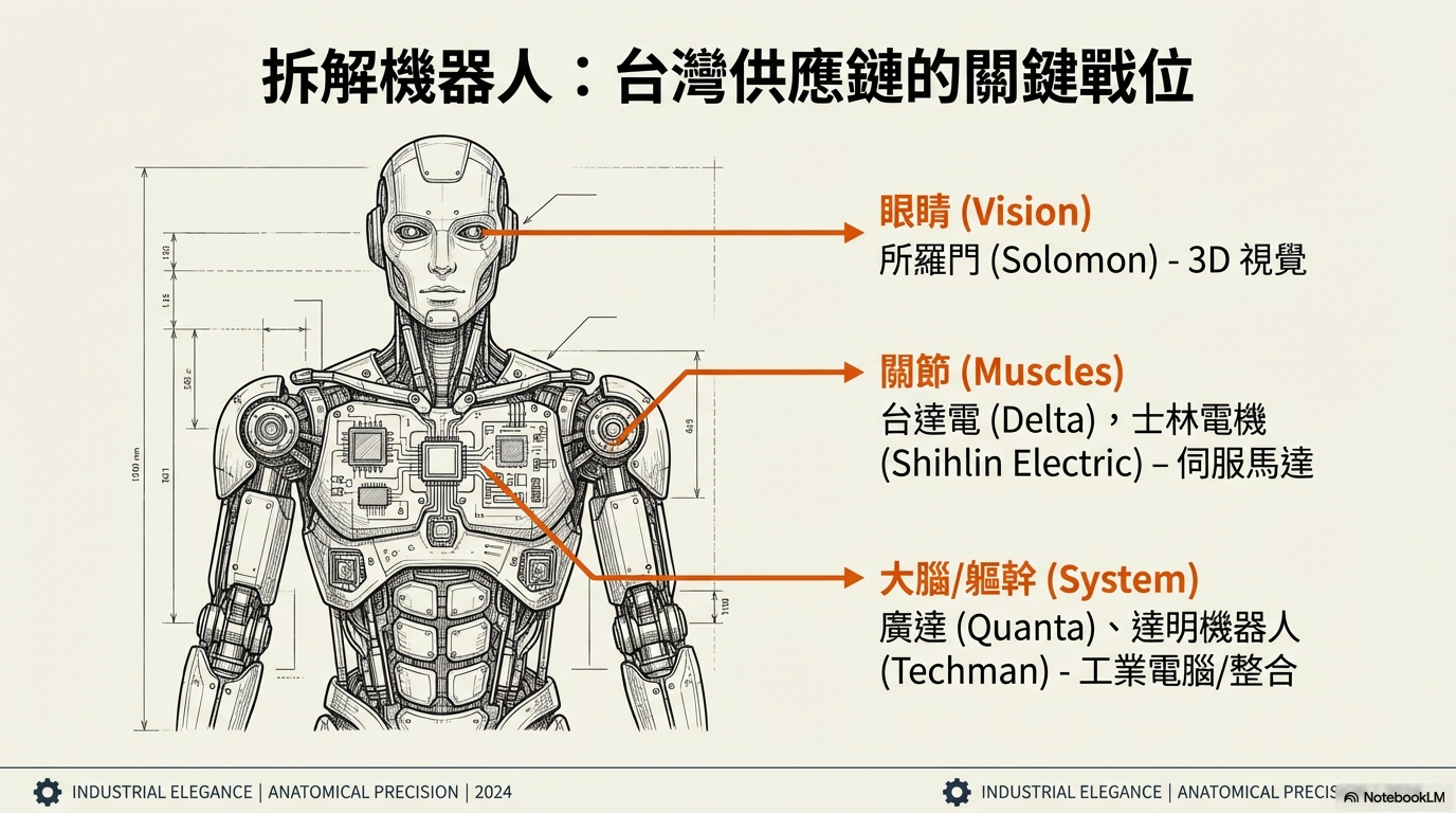 介紹 AI 如何從螢幕走入現實世界,結合視覺模型與機械控制。點名所羅門、廣達等台灣供應鏈如何成為機器人的軍火庫。